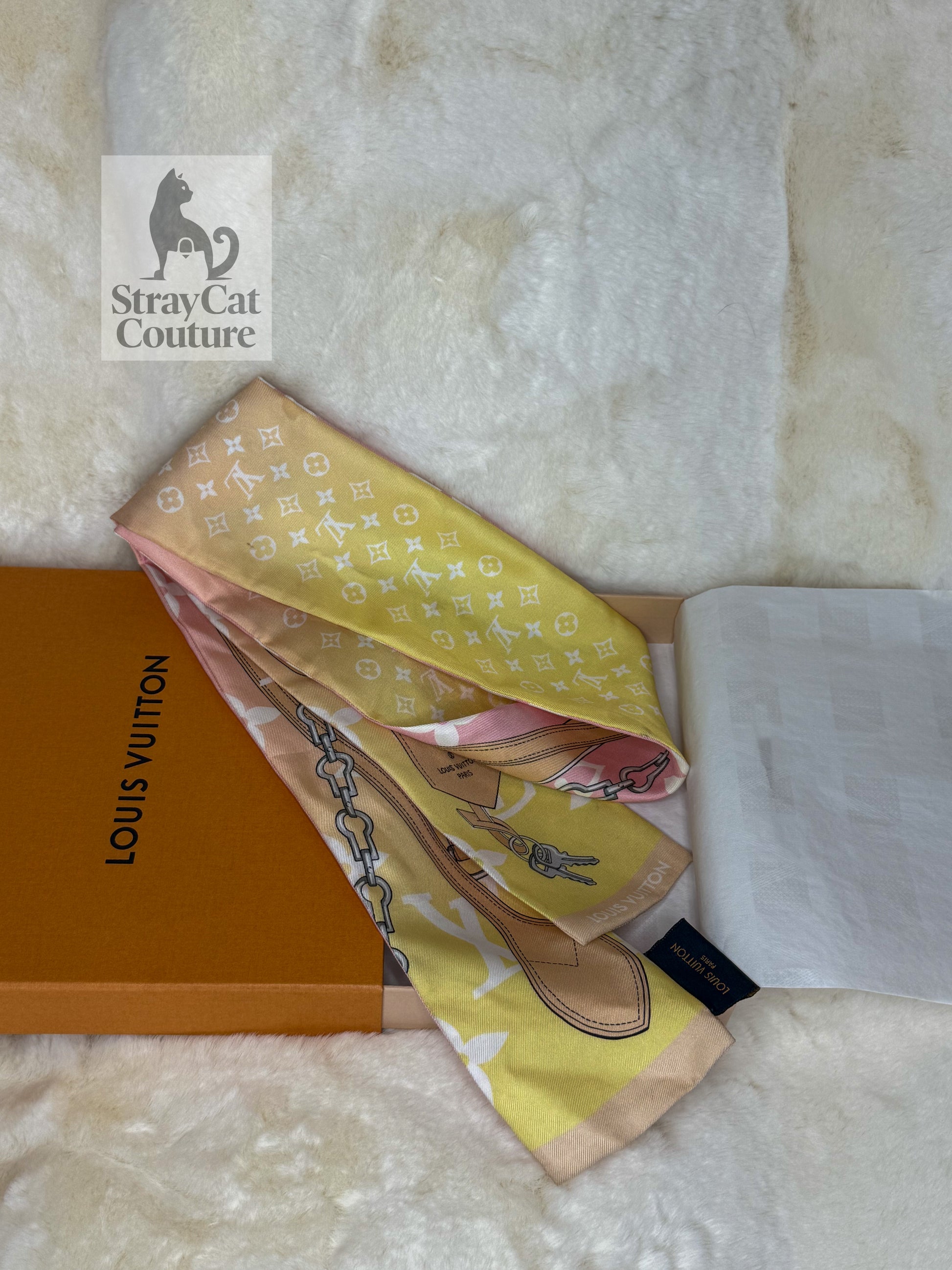 Friends dive into luxury this summer with this stunning Louis Vuitton silk scarf in a delightful yellow and pink gradient. Perfect for adding a pop of color to your poolside ensemble, this beauty comes with light signs of love but is still in great condition! Whether you style it as a head wrap, a chic accessory on your favorite bag, or whatever your heart desires, this scarf is your go-to for effortless elegance. Don't miss out—grab it now and make waves this season!