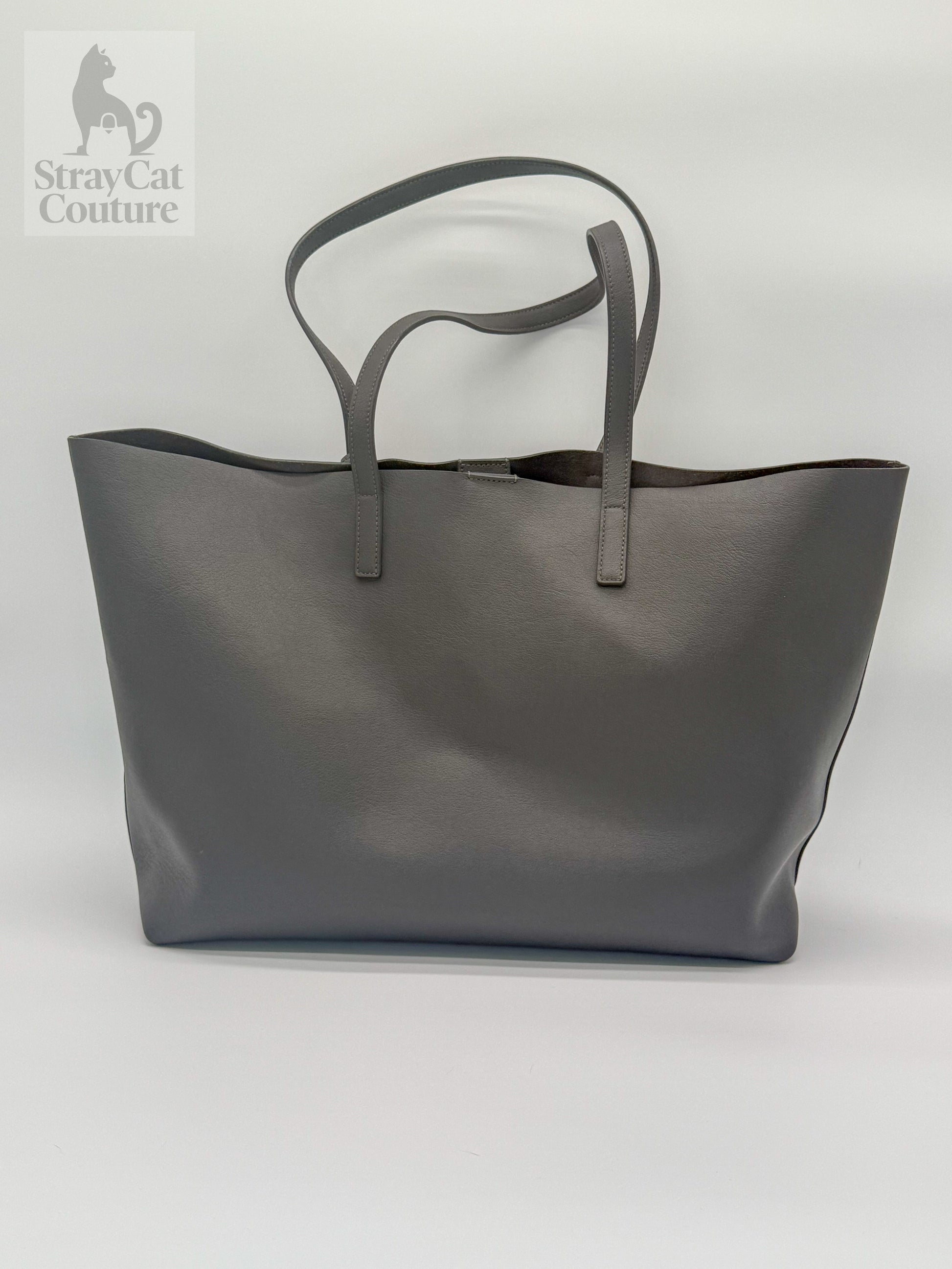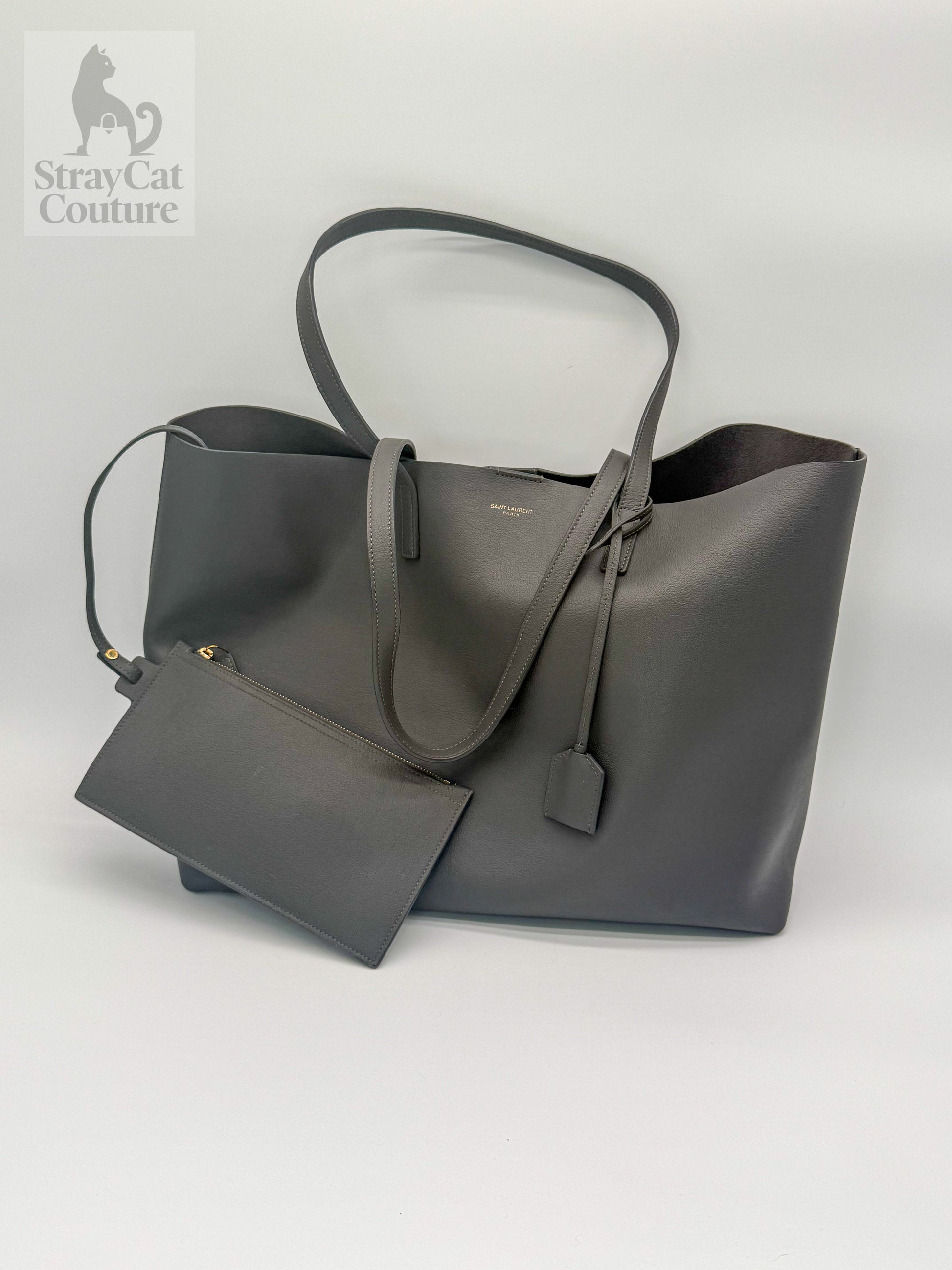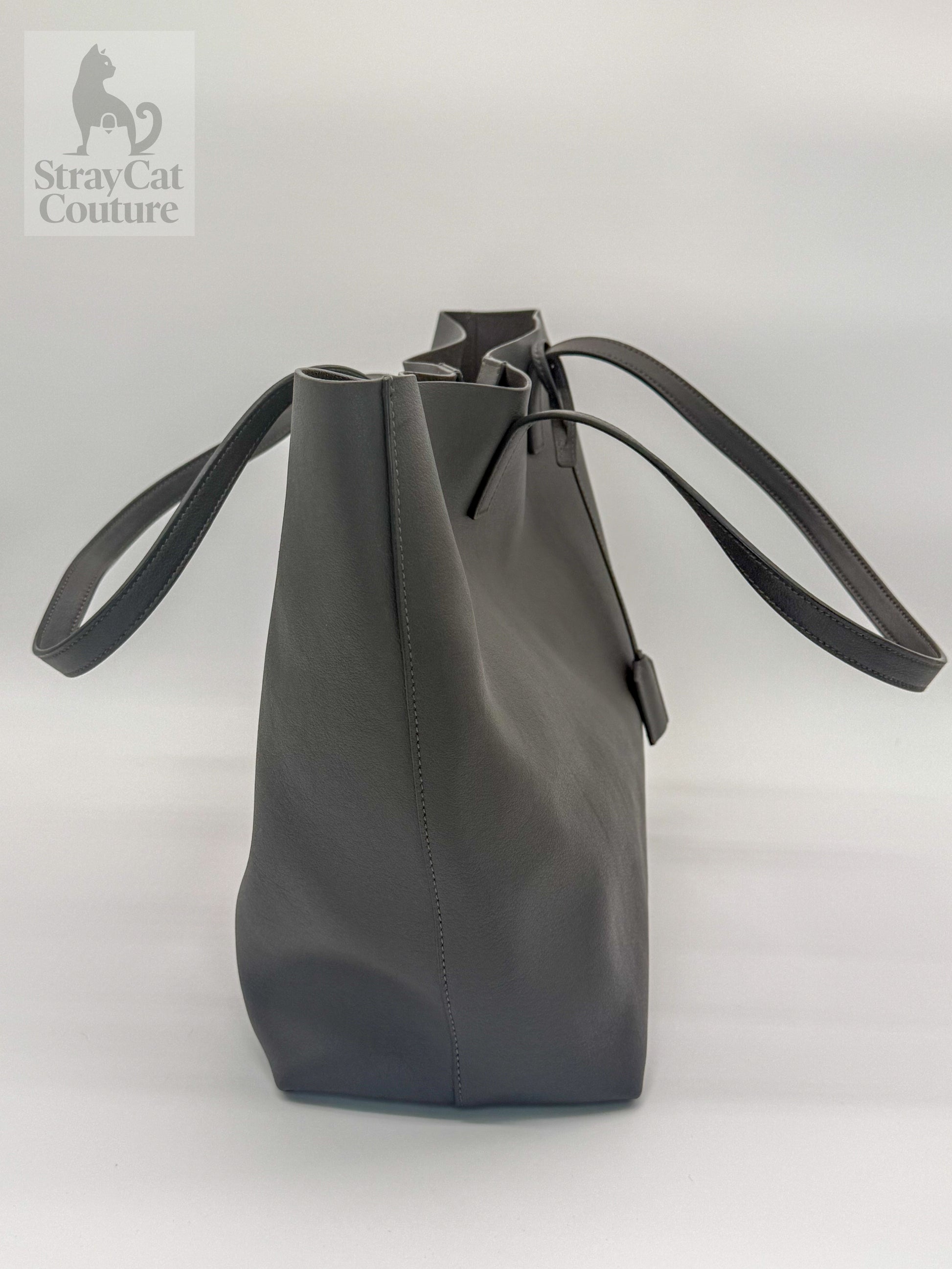 Add a refined edge to your everyday wardrobe with this Saint Laurent grey leather tote. Featuring sleek gold-tone hardware and a spacious suede-lined interior, this timeless piece is both functional and effortlessly elegant.